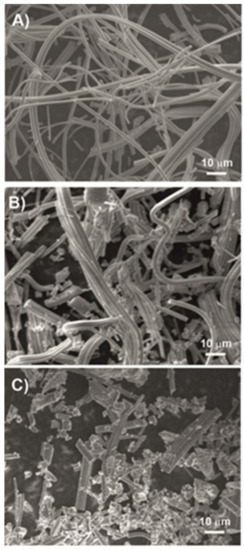 Based on the morphological similarity of nanofibers’ shapes to pathogenic fibers such as asbestos, there is concern about safety and health implications after exposure [15]. Many studies testing new NMs have confirmed this. Hamilton et al. (2009) compared anatase TiO2 in the form of nanospheres and two different lengths of nanobelts. They described that the cytotoxicity of nanospheres and short nanobelts was insignificant, while the nanobelts with lengths >15 µm showed a significant increase in toxicity [16]. Schinwald et al. (2012) suggested that, for silver nanowires, the threshold length for the pathogenicity of the material in mice is >5 µm [17]. On the other hand, Cacchioli et al. (2014) described the cytocompatibility of SiC/SiO2 core–shell nanowires with different cell types up to a concentration of 100 µg/mL [18].