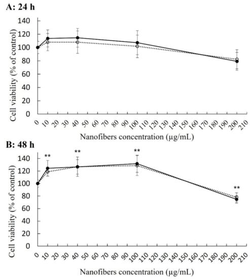 The effect of SiO2 nanofiber (SiO2NFs) lengths on the cytotoxic response. Cytotoxicity of L-SiO2NFs (○) or S-SiO2NFs (•) detected by WST-1 assay. Data were collected after 24 h (plot A) and 48 h (plot B) of treatment of THP-1-derived macrophage-like cells with different concentrations of SiO2NFs. Statistical analysis was performed by one-way analysis of variance, ** p = 0.005 (n > 6).