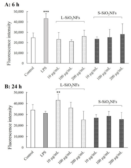 However, these first results led us to an additional detailed study where we tested the cellular responses to different lengths of SiO2NFs. The results monitoring reactive oxygen species (ROS) production induced by SiO2NFs are summarized in Figure 3. ROS are considered to be an important mediator in proinflammatory signaling pathways activation, and the increase in their production is connected to phagocytosis or cell stimulation with various agents [27]. Figure 3 shows the experimental data obtained by the H2DCFDA assay after 6 and 24 h of treatment with different concentrations of L- and S-SiO2NFs (10, 100, and 200 µg/mL), as well as with lipopolysaccharide (LPS) (1 µg/mL) as a positive control. LPS is a component of Gram-negative bacteria membranes that stimulates macrophages, resulting in an inflammatory response, including ROS production. Within 6 h of treatment, the cells treated with both SiO2NFs showed no significant difference in ROS production compared to the nontreated control cells (Figure 3A). The opposite trend was observed in cells after 24 h of treatment (see Figure 3B). The ROS production after 24 h of treatment with L-SiO2NFs (10 µg/mL) was significantly increased. After 24 h of exposure to 100 and 200 µg/mL of L-SiO2NFs, the ROS production was at the same level as the nontreated control cells, which might be due to the cell damage caused by high L-SiO2NF concentrations. The ROS production levels after exposure to all concentrations of S-SiO2NFs were comparable to the nontreated control cells’ level. Notable results were obtained for the LPS treatment (positive control) after 24 h, where the ROS level decreased to the nontreated control cells’ level. This result was in agreement with the data presented by Widdrington et al. (2018), who measured the LPS-induced ROS production in THP-1 cells for up to 72 h and observed a peak in ROS production at the 6-h mark and then a gradual decrease afterwards. They suggested it was the result of compensatory cellular mechanisms (including antioxidant defenses, mitochondrial biogenesis, and mitophagy) triggered after the LPS treatment [28]. The results for the materials tested in this study indicated that ROS production could be induced only by L-SiO2NFs after 24 h of incubation.
