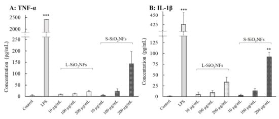 The proinflammatory cytokines such as TNF-α and IL-1β are required for activation of the innate immune response and mediation of the recruitment, activation, and adherence of circulating phagocytic cells (macrophages and neutrophils) [29]. In the following experiments, we studied the ability of L- and S-SiO2NFs to increase TNF-α and IL-1β production. The levels of TNF-α and IL-1β produced by treated THP-1-derived macrophage-like cells are graphically expressed in Figure 4A and Figure 4B, respectively. After the treatment with L-SiO2NFs, there was only a small increase in cytokine production for the highest tested concentration of L-SiO2NF. On the other hand, the cellular response to S-SiO2NF was much more prominent. The highest concentration of S-SiO2NF (200 µg/mL) caused an increase in both measured cytokines, especially in IL-1β production. The results indicated that TNF-α and IL-1β expression and, thus, inflammation is concentration-dependent and can be induced by S-SiO2NFs but not by L-SiO2NFs.