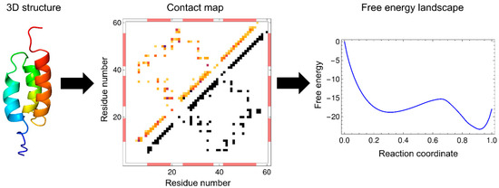 Calculation of the free energy using the WSME model requires setting an entropic cost associated with the folding reaction and preparing a residue–residue contact map and the energy for each contact based on the native structure of a protein (Figure 2). A residue pair is defined as being in contact when the distance between two residues in the native state is within a specific cutoff (typically 4 Å). The simplest way to assign contact energies is to use the same energy value for all the native contacts. Surprisingly, even with this simple treatment, the calculated free-energy landscapes effectively explained the folding processes experimentally observed for many small proteins [26,37,39,40,41,42,43,48,49]. Another way of assigning contact energies is to weigh the contact energy, depending on the number of atoms involved in the contact [13,20,45,50,51,52,53]. The use of weighted contact energies may yield more accurate results than the use of uniform contact energies.