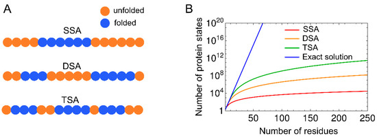 (A) Schematic representation of protein states with single, double, and triple sequence approximations (SSA, DSA, and TSA, respectively). Residues in folded or unfolded conformations are indicated by blue and orange circles, respectively. In the SSA, only the protein states with a single native segment are considered. In DSA and TSA, the protein states with up to two and three native segments are considered, respectively. (B) Number of microscopic protein states, which is considered in the calculation of the partition function using the SSA, DSA, TSA, and exact solution, is plotted against the number of residues.