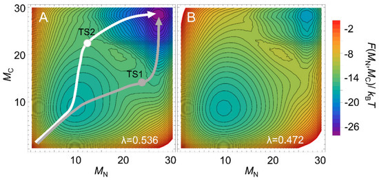 Two-dimensional free-energy landscapes of BdpA under folding conditions (A) and at the transition midpoint (B). The native structure of BdpA is shown in Figure 2 (left panel). MN and MC are the number of folded residues in the N-terminal half of BdpA (involving the first helix and the first half of the second helix) and C-terminal half of BdpA (involving the second half of the second helix and the third helix), respectively. Gray and white arrows denote the dominant folding pathways passing through the saddle points corresponding to the transition state 1 (TS1) and transition state 2 (TS2), respectively. λ = ε/(kB T) is a parameter related to the uniform contact energy ε and temperature T. Adapted with permission from Ref. [26]. Copyright (2006) National Academy of Sciences, U.S.A.