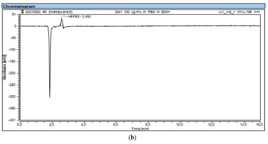 For the development of a feasible UV-HPLC method to detect HEPES, its chemical and physical properties need to be considered, such as a UV/vis absorption wavelength that is below 200 nm, or 220 nm for [68Ga]Ga-radiopharmaceuticals [21,22,23,24,25,26]. We started from a ‘‘mother’’ solution with the highest concentration (250 μg/mL) of HEPES, obtained by dissolving the analyte in phosphate buffer solution (PBS) with 10% ethanol and serial dilutions (100, 80, 60, 40, 20, 10, 5, 3 μg/mL).