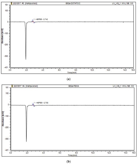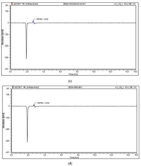 HPLC chromatogram of HEPES content in [68Ga]Ga-DOTATOC (a); [68Ga]Ga-PSMA (b); [68Ga]Ga-NODAGA-Exendin-4 (c); and [68Ga]Ga-Pentixafor (d).