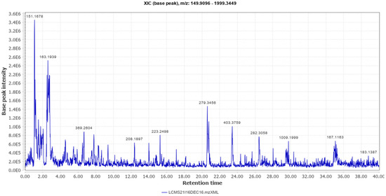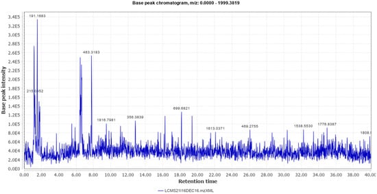 Different classes of constituents such as alkaloids, flavonoids, steroids, tannins, and polyphenols were revealed by preliminary phytochemical analysis. The LCMS analysis of the crude extract revealed a large number of phytoconstituents (Table 1). The total ion chromatogram (positive mode), and total ion chromatogram (negative mode) are given as Figure 1 and Figure 2 respectively.