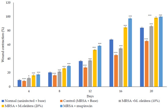 M. oleifera extract ointment preparation on the percentage of wound contraction in MRSA-infected wounds. All values are mean ± SEM, n = 6, * p < 0.05 when compared to control; *** p < 0.001 when compared to control; +++ p < 0.01 when compared to normal.