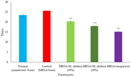 Epithelization period in MRSA-infected wounds in rats. All values are mean ± SEM, n = 6, *** p < 0.001 when compared to control.