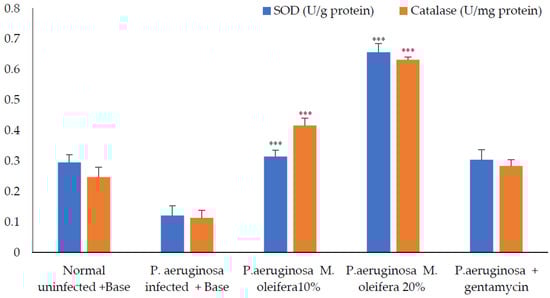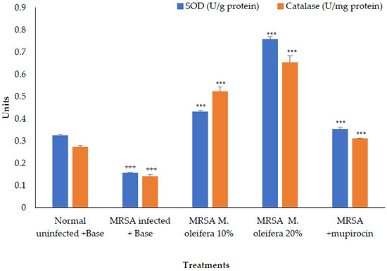 The antioxidant enzymes SOD and catalase were decreased in the wounded tissue in the MRSA-infected wound. There was a significant increase (p < 0.001) in the enzyme activity after the application of M. oleifera extract. Mupirocin also induced an increase in antioxidant enzyme activity, though the effect was lower compared to the M. oleifera extract (Figure 6).