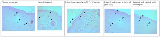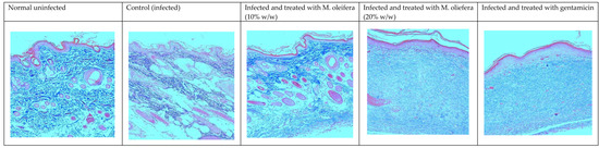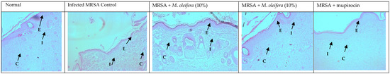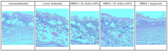 MRSA infection suppressed wound healing that was indicated by a reduction in the epidermal height, number of capillaries, and inflammatory cells with less collagen in the wounded area. Application of M. oleifera extract increased epidermal height, angiogenesis, and collagen deposition when compared with infection control. Inflammatory cells were also reduced in the treated wounds. Nevertheless, reduced inflammatory cells, epithelial height, and collagen deposition were noticed after mupirocin application (Figure 7 and Figure 8). The microbial load was significantly reduced after treatment with the extract and antibiotics. In the infected animals, the bacterial count on the 20th day was around 81.5 × 104 CFU/g of the tissue. In extract-treated groups, it was reduced to about 27.3 × 104 CFU/g with 20% of the extract and to 32.7 × 104 CFU/g after the application of the 10% of the extract. It was lowest in the antibiotic-treated animals, where the CFU was around 19 × 104 CFU/g.