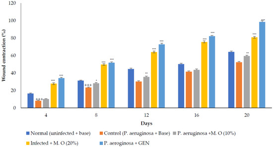 M. oleifera extract ointment preparation on the percentage of wound contraction in P. aeruginosa-infected wounds. All values are mean ± SEM, n = 6, +++ p < 0.001 when compared to normal. * p < 0.05, ** p < 0.01, *** p < 0.001 when compared to control.