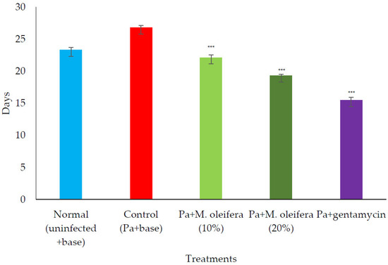 Effect on the period of epithelization in P. aeruginosa (Pa)-infected wounds in rats. All values are mean ± SEM, n = 6, *** p < 0.001 when compared to control (infected).