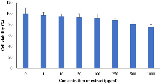Effect of M. oleifera extract on the cell viability of human keratinocytes (HaCaT) cells. All values are mean ± SEM, n = 6.