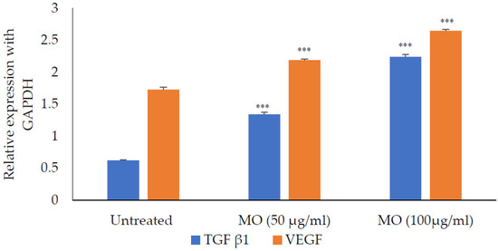 Expression of TFG-β1 and VEGF in the presence of M. oleifera (MO) extract. All values are mean ± SEM, n = 6, *** p < 0.001 when compared to untreated cells.