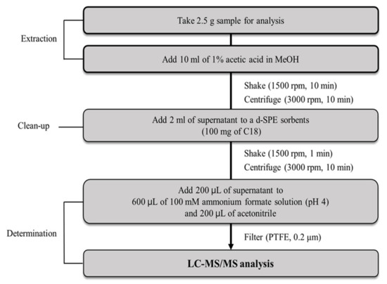 - Anastassiades, M.; Lehotay, S.J.; Stajnbaher, D.; Schenck, F.J. Fast and easy multiresidue method employing acetonitrile extraction/partitioning and “dispersive solid-phase extraction” for the determination of pesticide residues in produce. J. AOAC Int. 2003, 86, 412–431. [Google Scholar] [CrossRef] [PubMed] [Green Version]