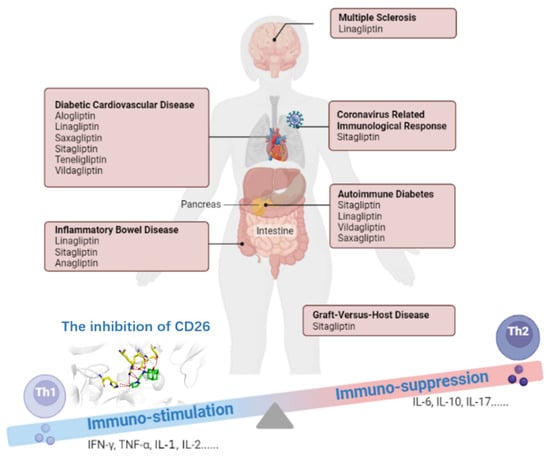 The effect of CD26 inhibitors performed therapeutically in different immune-mediated diseases through a biased Th1 to Th2 cytokine profile. The inhibition of CD26 breaks Th1-cell-mediated immune stimulation, as well as activating the Th2-cell-mediated immune suppression.