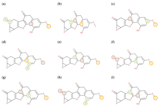 Prediction of DL site of metabolism by RS-Predictor at: (a) CYP1A2, (b) CYP2A6, (c) CYP2B6, (d) CYP2C8, (e) CYP2C9, (f) CYP2C19, (g) CYP2D6, (h) CYP2E1, (i) CYP3A4. Color code: orange: highly labile, grey: moderately labile, and light green: fairly labile.