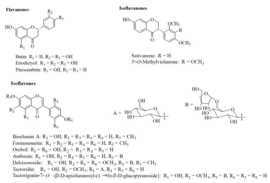 Former phytochemical investigations of the heartwoods, leaves, and roots of D. tonkinensis resulted in the isolation of more than 35 flavonoids. The chemical structures of the compounds here investigated were previously identified by NMR analysis and literature comparison including the flavones: butin, eriodictyol [], and pinocembrin []; the isoflavanones: sativanone and 3′-O-methylviolanone []; the isoflavones: biochanin A, formononetin [], and orobol []; the isoflavone glycosides: ambocin [], dalsissooside [], tectoridin, and tectorigenin-7-O-[β-D-apiofuranosyl-(1→6)-β-D-glucopyranoside] [] (Figure 1).