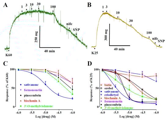 Figure 2 shows the representative traces of the effects of biochanin A on the contraction induced by either 60 (panel A) or 25 mM KCl (panel B). The addition of cumulative concentrations of the compound on the plateau of KCl-induced active tone caused a concentration-dependent relaxation that was more evident when the degree of membrane depolarisation was reduced (i.e., at 25 mM KCl). As summarised in Figure 2C,D and Table 1, both isoflavanones (i.e., sativanone and 3′-O-methylviolanone), the flavanone pinocembrin and, to a lesser extent, the isoflavones, formononetin and biochanin A, were the most effective vasorelaxant agents on both types of contractions, efficacy being indirectly correlated to the extracellular concentration of KCl. Orobol and, to a lesser extent, eriodictyol, relaxed only 25 mM KCl-induced contractions. All other molecules assessed were ineffective (Table 1).