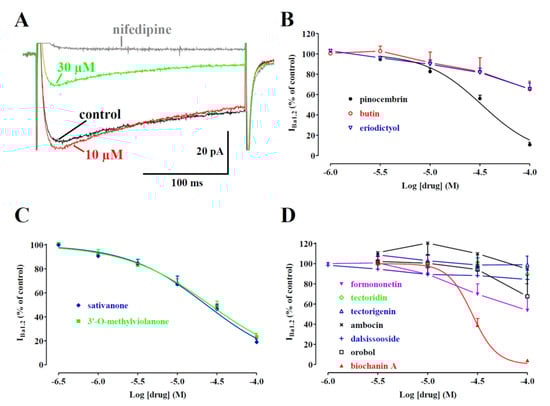 Effects of Dalbergia isolates on IBa1.2 in single tail artery myocytes: (A) average traces (recorded from 5 cells) of IBa1.2, elicited with 250 ms clamp pulses to 0 mV from a Vh of −50 mV, measured in the absence (control) or presence of cumulative concentrations of biochanin A; (B–D) concentration-dependent effects of (B) flavanones, (C) isoflavanones, and (D) isoflavones. On the ordinate scale, current amplitude is reported as a percentage of the value recorded just before the addition of the first concentration of Dalbergia isolate. The curves show the best fit of the points. Data points are the mean ± SEM (n = 1–6).