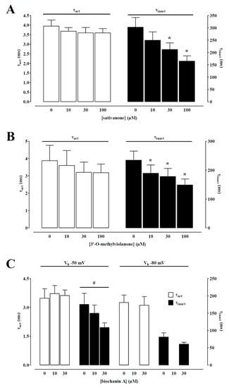 Effect of sativanone, 3′-O-methylviolanone, and biochanin A on IBa1.2 kinetics of single tail artery myocytes. Time constant for activation (τact) and inactivation (τinact) measured in the absence or presence of various concentrations of (A) sativanone, (B) 3′-O-methylviolanone, and (C) biochanin A from a Vh of either −50 or −80 mV. Columns represent the mean ± SEM (n = 5–6). * p < 0.05 vs. control; one-way ANOVA and Dunnett post hoc test. # p < 0.05, one-way ANOVA.