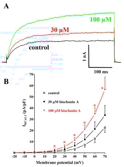 Effects of Dalbergia isolates on IKCa1.1 in single tail artery myocytes: (A) original recordings (average traces of 6 cells) of conventional whole-cell IKCa1.1 elicited with a 500 ms voltage step from Vh -40 to 70 mV, measured in the absence (control) and presence of 30 and 100 μM biochanin A; (B) current–voltage relationships obtained before the addition (control) and in the presence of various concentrations of biochanin A. On the ordinate scale, the response is reported as the current density in pA/pF. Data points are the mean ± SEM. * p < 0.05 vs. control; repeated measures ANOVA and Dunnett’s post hoc test.