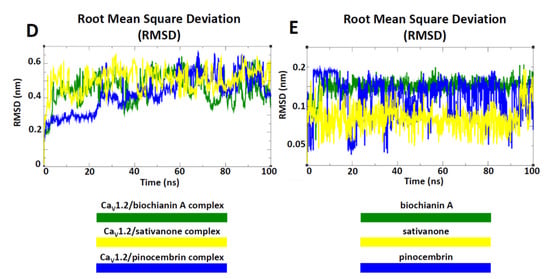 Overview of the CaV1.2 channel docked with biochanin A, sativanone, and pinocembrin. The CaV1.2 channel’s 3D structure is depicted with a multicolour transparent surface, while the binding pocket is reported in red. The bilayer is represented by grey lines, and some phospholipid heads are shown as orange spheres. The extracellular and cytoplasmatic side is shown as a blue surface. (A–C) Interaction network of (A) biochanin A, (B) sativanone, and (C) pinocembrin in complex with the CaV1.2 binding residues (i.e., red balls and sticks) after the docking simulation. The hydrogen bond is represented as a purple dotted line. (D,E) Root mean square deviation (RMSD) profiles of biochanin A, pinocembrin, and sativanone. (D) RMSD profiles of the CaV1.2 channel backbone in complex with biochanin A, pinocembrin, and sativanone. (E) RMSD profiles of the biochanin A, pinocembrin, and sativanone binding pose in complex with the CaV1.2 channel. The RMSD trends are represented as coloured lines (see legend). RMSD (nm) and time (ns) values of the MD run are reported on the y- and x-axis, respectively.