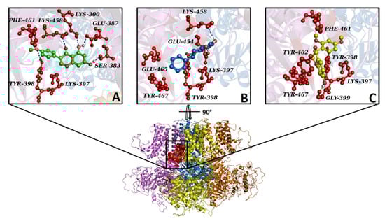 In silico results showed that biochanin A, sativanone, and pinocembrin were able to spontaneously bind to the KCa1.1 channel showing Gibbs free energy values (ΔG) of −6.1, −5.8, and −5.4 kcal/mol, respectively. Despite the compounds sharing the same binding pocket (Figure 8), they formed a different interaction network, likely due to the differences in their structures and chemical–physical proprieties. Biochanin A formed hydrophobic interactions with Lys-397, Lys-458C, and Phe-461C; five hydrogen bonds with Lys-300C, Ser-383C, Glu-387C, Tyr-398C, and Lys-458; a π stacking with Tyr-398C (Figure 8A). Pinocembrin triggered four hydrophobic interactions with Lys-397C, Lys-458C, Glu-465C, and Tyr-467C; three hydrogen bonds with Tyr-398C, Glu-454C, and Lys-458C; a π stacking with Tyr-398C (Figure 8B). Sativanone was involved in four hydrophobic interactions with Lys-397C, Tyr-402C, Phe-461C, and Tyr-467C; a hydrogen bond with Gly-399C; a π stacking with Tyr-398C (Figure 8C).