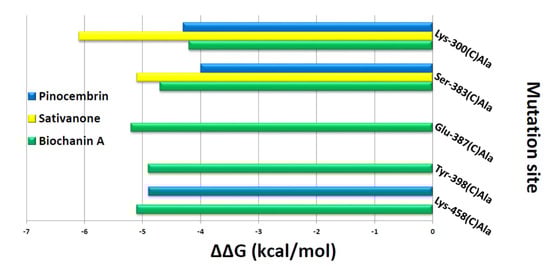 The interaction network between KCa1.1 channel binding pocket residues and the three flavonoids was further investigated by performing computational alanine-scanning mutagenesis, taking into account only the residues involved in hydrogen bonds. When considering the contribution of electrostatic energy, hydrogen bonds, Van der Waals force, and desolvation energy, a significant loss in the binding free energy of biochanin A was observed when Glu-387C (ΔΔG = −5.2 kcal/mol) and Tyr-398C (ΔΔG = −4.7 kcal/mol) were mutated to alanine. On the contrary, this contribution was negligible for pinocembrin and sativanone (Figure 9).