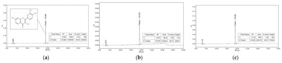 Fraction compound of R. verniciflua-seed ethanol extract identified by high-performance liquid chromatography. (a) Fisetin (Standard, Sigma-Aldrich Inc., St. Louis, MO, USA); (b) sample (fraction of R. verniciflua seed 50% ethanol extract); (c) spike test of sample and fisetin.