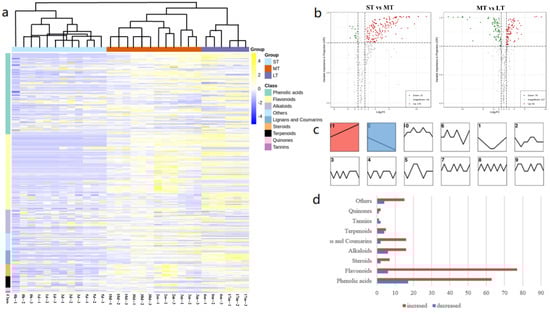 Secondary metabolites of D. cochinchinensis stems at different times after wounding: (a) heatmap and clustering of metabolic profile of samples at different times after wounding; (b) volcano plot of samples in different stages after wounding; (c) trend analysis result of samples over time after wounding; (d) types of compounds in trend 11 and 0.