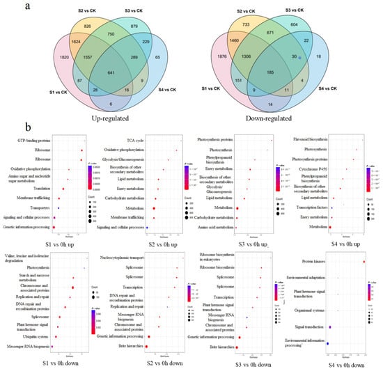 According to the clustering, responses at the genetic level could be roughly divided into four stages: S1, within 24 h; S2, 3–5 days; S3, 10–30 days; S4, 17 months. The upregulated and downregulated DEGs between different stages and 0 h were shown in Figure 2a. A total of 641 genes were upregulated in all four stages, while 185 genes were downregulated in all four stages. S1 had the most abundant DEGs, while S4 had the fewest DEGs. KEGG analysis showed that, in S1, the ribosome, translation, and genetic information processing were the most upregulated pathways, while chromosome and associated proteins, the spliceosome, and the ubiquitin system were the most downregulated pathways. In S2, the TCA cycle, glycolysis/gluconeogenesis, and the biosynthesis of secondary metabolite became upregulated, whereas most genes in protein families, genetic information processing, and the spliceosome were downregulated with a high Rich factor. In S3, glycolysis/gluconeogenesis and biosynthesis of secondary metabolites remained upregulated, and phenypropanoid biosynthesis appeared to be upregulated, whereas the ribosome and spliceosome remained downregulated. In S4, the flavonoid biosynthesis had the highest Rich factor among the upregulated items, while protein kinases had the highest Rich factor among the downregulated items (Figure 2b).