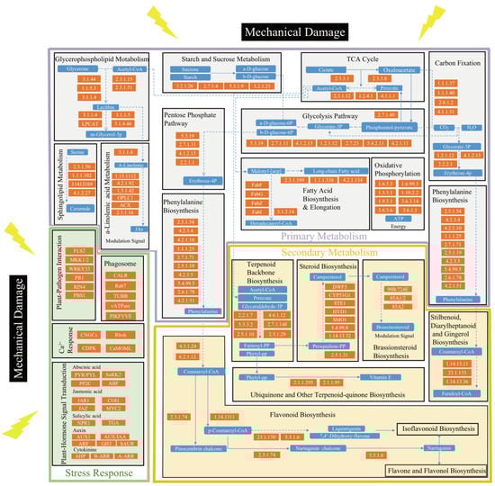 Connected KEGG Pathways of D. cochinchinensis under wound stress. The orange frame with numbers indicates upregulated genes; the blue frame indicates key metabolites; the full line indicates one-step reactions; the dotted line indicates reactions with multiple steps and the connections among different pathways.