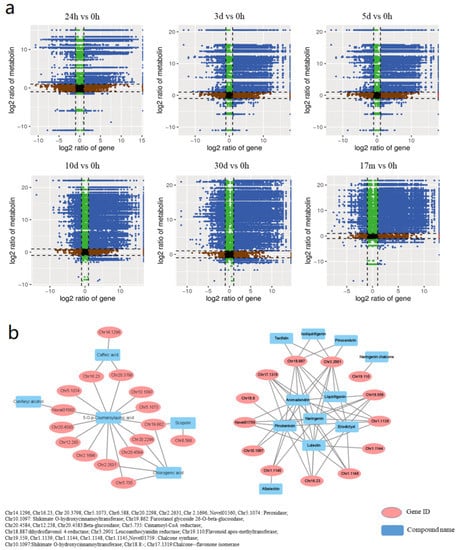 Correlation analysis of DEGs and DEMs: (a) nine-quadrant diagram of unigenes and compounds at different wounding timepoints. Unigenes and compounds in quadrants 3 and 7 have accordant tendency; unigenes and compounds in quadrants 1 and 9 have reverse tendency; unigenes and compounds in quadrant 5 are not differentially expressed; unigenes and compounds in quadrants 2, 4, 6, and 8 have no obvious tendency; (b) network of DEGs and DEMs in phenylpropanoid biosynthesis and flavonoid biosynthesis pathways.