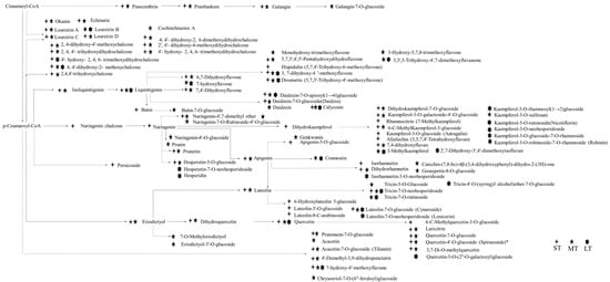 Flavonoid biosynthesis profile at chemical level in D. cochinchinensis after wounding. ST, short term; MT, middle term; LT, long term.