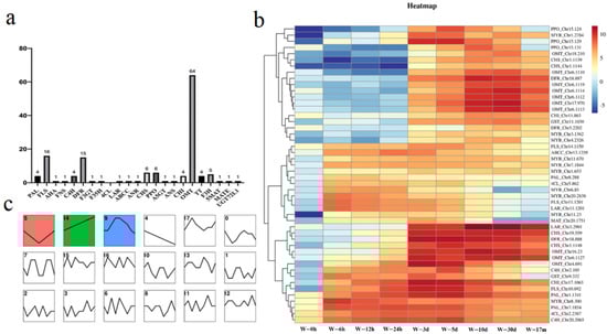 Flavonoid biosynthesis profile at genetic level in D. cochinchinensis after wounding: (a) types of annotated genes in flavonoid biosynthesis; (b) trend analysis result of genes related to flavonoid biosynthesis; (c) heatmap and clustering of wound-induced genes related to flavonoid biosynthesis.
