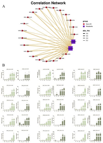 The EXCEL file containing both metabolism and transcriptome analysis results was used to calculate the Pearson correlation coefficients according to the fold changes of DEGs and each DEM. Correlations corresponding to a coefficient with R2 > 0.8 were selected. DEGs and DEMs annotated in specific KEGG pathways with high correlation scores were selected to draw the correlation network.