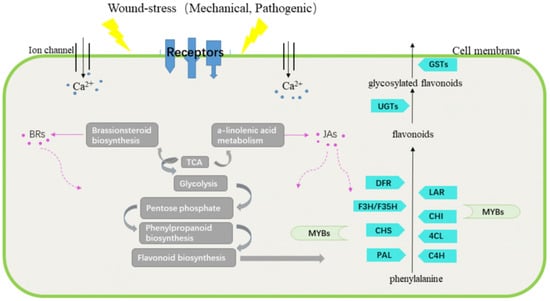 Biotic and abiotic stresses frequently cause mechanical damages to plants; hence, plants have evolved various strategies to defend themselves against mechanical damages []. While suffering through mechanical damages, plants generate signal molecules, activate the expression of defense-related genes, and produce defensive compounds by adjusting the metabolism process to prevent the spread of the injury and secondary damages [,,]. By adjusting the metabolism processes, plants can cooperate with the surrounding environment, defend themselves, and benefit animals. Flavonoids are one of the largest classes among the plant secondary metabolites and have been proved to be closely related to plant defense []. Plants which are rich in flavonoids could be used as nutraceutical and medical agents as they have antioxidative, anti-inflammatory, and antimutagenic effects [,]. Artificial damages are sometimes performed to efficiently induce plants to produce such secondary metabolites. Agarwood is a typical wound-induced material obtained from Aquilaria sinensis and exhibits high medicinal and cultural values. Under wound stress, A. sinensis initiates terpenoid and chromone synthesis to produce agarwood to relieve wound-stress. On the basis of this property, the whole-tree agarwood-inducing technique has been developed for the mass production of agarwood [].