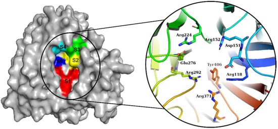 Lurasidone appears to accommodate more in the S1 and S2 subsites of the binding pocket (Figure 2B). Lurasidone also interacted with enzymatic amino acid residues in the active site, including Asp151, Arg292, Arg371, and Tyr406, and framework residues such as Glu277. As seen in Figure 3B, the lurasidone compound formed hydrogen bonds with Arg292, Arg371, and Lys342 amino acids, showing potential good inhibitory activity (Figure 3B).