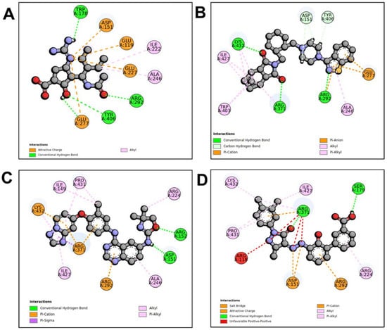 Molecular interaction profiles of NA with peramivir (A), lurasidone (B), tucatinib (C), and Promacta (D).
