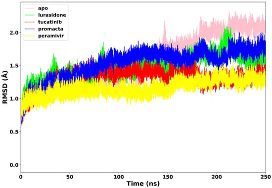 All four systems’ stability was investigated using RMSD of the C-α atoms. We analysed the structural stability of the docked compounds in the binding site and their effects on the overall system stability. During the simulations, the RMSD values of the entire system gradually converged and finally reached equilibrium at around 50 ns (Figure 4). The apo-enzyme showed an average RMSD value of 1.71 Å during the entire run. Lurasidone, tucatinib, and Promacta as well as the reference ligand, peramivir, complexed with NA exhibited average RMSD values of 1.48 Å, 1.31 Å, 1.53 Å, and 1.17 Å, respectively, which are lower than that of apo-enzyme. This shows that the presence of a ligand stabilizes the structure of the NA protein. The average RMSD for all the systems was found to be 1.40 Å, which is lower than the ideal 2 Å RMSD value [26]. According to the findings, all three systems were stable, which could be due to strong hydrogen bond interactions between the protein–ligand complexes.
