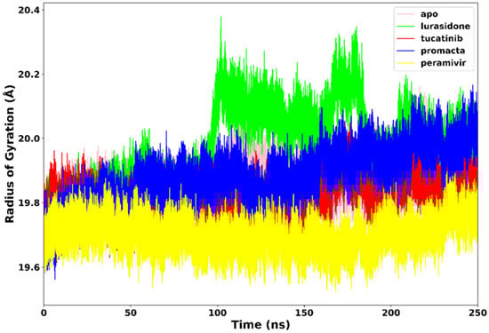 Radius of gyration trajectories of NA–ligand complexes during 250 ns simulations.