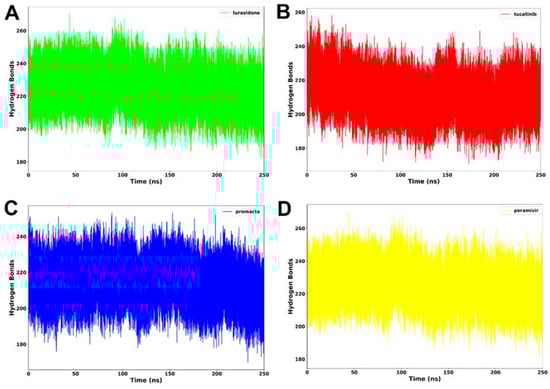 Hydrogen bond formation of NA complexed with lurasidone (A), tucatinib (B), Promacta (C), and peramivir (D) during 250 ns simulations.