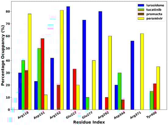 The phenomenon of hydrogen bonding was studied to determine which residues at the bonding site contribute to hydrogen bonding. For this purpose, the percentage occupancy of the hydrogen bonds was investigated. Throughout the 250 ns simulation time, the percentage of hydrogen bond occupancy (%) between the ligands and the active site residues was monitored (Figure 8). Based on our results, amino acid residues Arg118, Asp151, Arg152, Glu227, Glu277, Arg292, Asp344, Arg371, and Try406 were identified as the primary residues for hydrogen bonding between NA and the hit compounds, with the highest percentage occupancy, suggesting a significant contribution to system stabilisation. The interaction of the ligands with these primary residues has a significant impact on the efficacy of the ligand. As shown in Figure 6, the complexes of peramivir–, Promacta–, lurasidone–, and tucatinib–NA formed hydrogen bonds with Arg118 at 78%, 40%, 30%, and 32% occupancy throughout the simulation runs. Furthermore, Arg118 and Asp151 were found in nearly all complexes.
