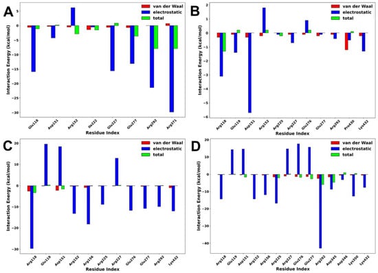 Interaction energy decomposition analysis was performed to gain an insight into the contributions of individual amino acids to the total free energy of binding of protein–ligand complexes. As shown in Figure 9, the amino acids with the highest residual energy contributions were Arg118 (−3.12 kcal/mol) and Asp151 (−5.74 kcal/mol) in the NA–lurasidone complex, Arg118 (−29.74 kcal/mol), Arg152 (−13.21 kcal/mol), and Arg156 (−18.29 kcal/mol) in the NA–tucatinib complex, Arg118 (−14.47 kcal/mol), Arg225 (−16.83 kcal/mol), and Arg292 (−42.90 kcal/mol) in the NA–Promacta complex, and Arg119 (−15.91 kcal/mol), Arg292 (−24.47 kcal/mol), and Arg371 (−29.85 kcal/mol) in the reference compound peramivir.