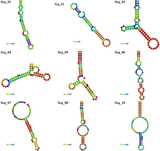 The random mutations were introduced in the 5uza sequence, and ten new sequences were generated (Table 3); then, the secondary and tertiary structures were predicted (Figure 1). Some structures, such as seq 08 and 09, have relatively high MFE indicating that the structure might be unstable.