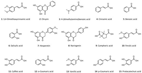 The theoretical (calculated) and the experimentally obtained masses typically agreed within 1.5 ppm accuracy. Most masses (m/z) from among the components studied (12 from the 15) were detected in the extracts; however, in several cases (e.g., 3,4-dimethoxycinnamic acid, camphoric acid, salicylic acid, chrysin) there was a mismatch in migration times between the standard and the sample component of equivalent m/z value. Since the amount of detected components was often very low, the peak with the expected m/z could be observed only in the extracted ion electropherogram recorded at the proper m/z value.