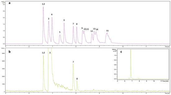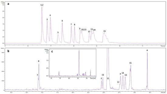 CZE-MS electropherograms obtained with (a) 0.5 M NH4OH (pH = 11.4) and (b) 50 mM ammonium-acetate (pH = 7) including an inset (c) which represents (b) the electropherogram with a larger intensity scale. The number of the peaks correspond with the number assigned to the components given in Figure 1. Conditions: capillary: 90 cm × 50 µm, U = +30 kV, sample injection: 50 mbar × 4 s, MS: negative ionization mode, sheath liquid: IPA:water = 1:1, sheath liquid flow: 6 μL/min, nebulizer pressure: 0.8 bar, drying temperature: 200 °C, spectra rate: 2 Hz. Sample: 3.833 mg/L 3,4-dimethoxycinnamic acid (1), 0.209 mg/L chrysin (2), 11.63 mg/L 4-(dimethylamino)benzoic acid (3), 17.44 mg/L cinnamic acid (4), 49.87 mg/L benzoic acid (5), 22.89 mg/L salicylic acid (6), 1.765 mg/L hesperetin (7), 1.637 mg/L naringenin (8), 7.881 mg/L camphoric acid (9), 4.968 mg/L ferulic acid (10), 85.66 mg/L caffeic acid (11), 19.98 mg/L o-coumaric acid (12), 15.69 mg/L vanillic acid (13), 35.706 mg/L p-coumaric acid (14), 8.73 mg/L protocatechuic acid (15).