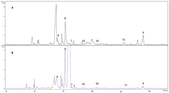 In order to test the CZE-MS method developed, two extracts of a sunflower honey sample were analyzed in triplicate (Figure 4). Reversed phase SPE cartridge was used for sample clean-up, whereby the high glucose/fructose content was removed and the phenolic compounds were collected for subsequent analyses. Two different extractions were carried out: ACN:water = 7:3 + 0.1% FA and MeOH:ACN = 2:1. The peak patterns of the base peak electropherograms obtained for the two extracts showed similarities (several components in similar migration windows and some peaks with the same migration time appeared (e.g., peaks at 6.42, 7.95, 8.35 and 8.86 min)) as well as considerable differences (e.g., a high intensity component can be seen at 9.4 min in Figure 4b, while in Figure 4a it shows very low signal intensity).