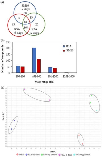 Metabolites of Streptomyces sp. SCSIO 001680: (a) unique and common metabolites after growth in R5A and SM10 media, (b) number of metabolites (masses) within mass ranges for each media, and (c) two-dimensional plot of metabolites produced in SM10 and R5A media by PCA analysis.
